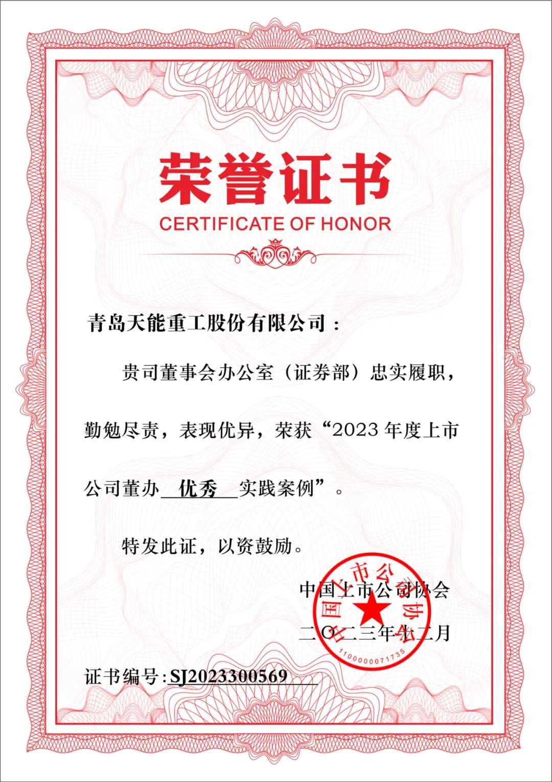 12月12日,中國(guó)上市公司協會“2023上市公司董辦最佳實踐”創建活動結果發(fā)布,天能(néng)重工董事(shì)會辦公室(證券部)榮獲“2023年度上市公司董辦優秀實踐案例”獎項,體現了中國(guó)上市公司協會對(duì)天能(néng)重工在上市公司規範運作和創新實踐等方面(miàn)的高度認可。