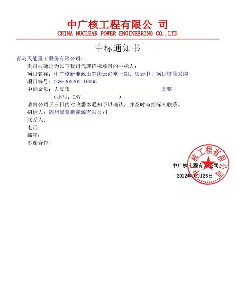 天能(néng)重工中标中廣核山東慶雲尚堂一期、慶雲中丁項目塔筒采購