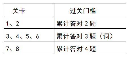 (3)當用戶答對(duì)的題目數(詞數)≥過(guò)關門檻則闖關成(chéng)功,獲得相應權益值并計入權益值排行榜。如用戶挑戰關卡失敗,則該關權益值清零,失敗關卡支持重複挑戰。過(guò)關門檻具體如下: